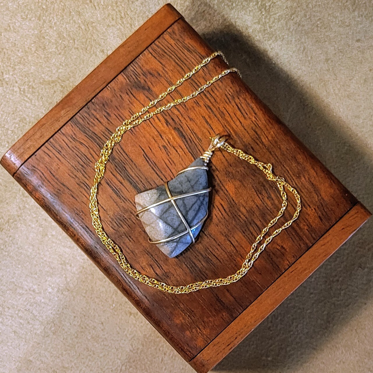 Item #7-10 - JASPER STONE WRAPPED IN GOLD FILLED SQUARE WIRE ON A 18" GOLD FILLED CHAIN 1 1/4 " PENDANT